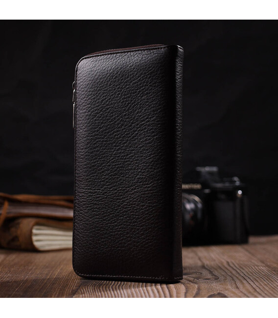 Практичний гаманець для сучасних жінок із натуральної шкіри. Аксесуар складається з трьох відділень для купюр, шести осередків для пластикових карток, трьох прилеглих кишень та монетниці. У виробі використано якісну фурнітуру. Закривається гаманець на блискавку. Якісний і надійний гаманець - саме такий аксесуар повинен бути у кожної людини, що поважає себе.