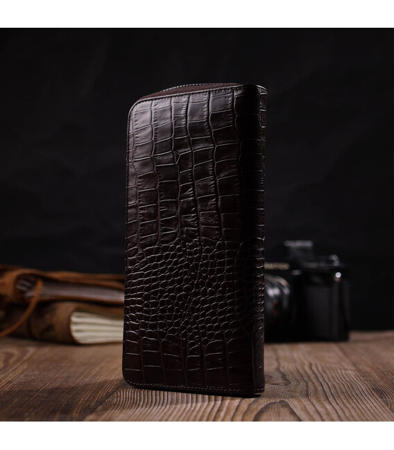 Гарний гаманець для сучасних жінок із натуральної шкіри з тисненням під крокодила. Аксесуар складається з трьох відділень для купюр, шести осередків для пластикових карток, трьох прилеглих кишень та монетниці. У виробі використано якісну фурнітуру. Закривається гаманець на блискавку. Якісний і надійний гаманець - саме такий аксесуар повинен бути у кожної людини, що поважає себе.