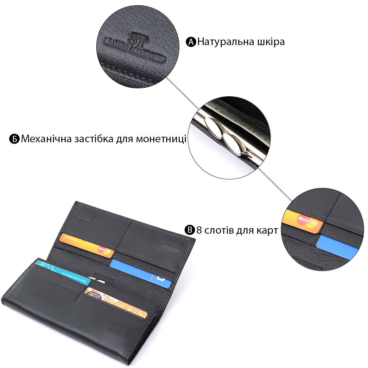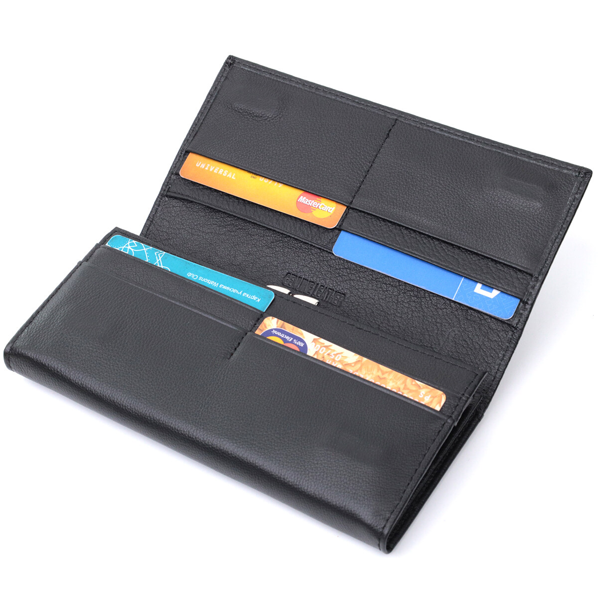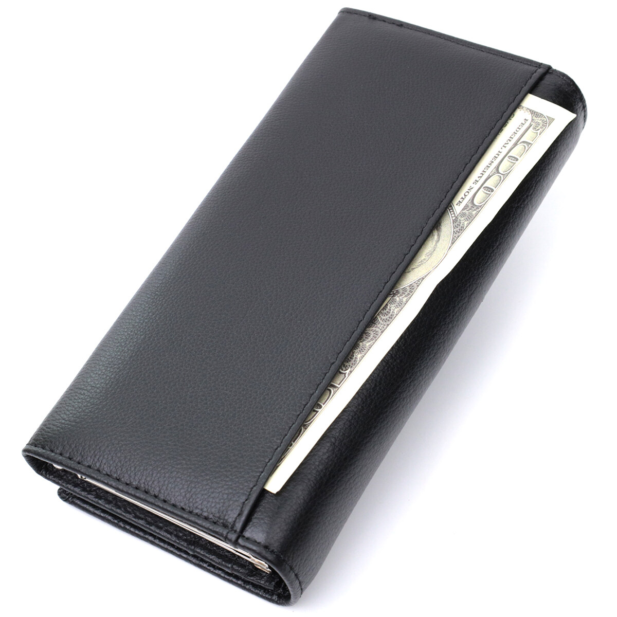 Місткий жіночий гаманець у два складення з натуральної якісної шкіри. Для перегородки між відділеннями використовується натуральна шкіра та міцний текстиль. Виріб складається з трьох великих відділень для купюр, двох прилеглих кишень, кишені на блискавці, восьми осередків для карток та монетниці. Продається гаманець у красивій коробці від виробника. Закривається гаманець клапаном на магніти.