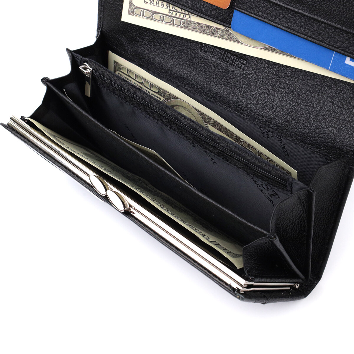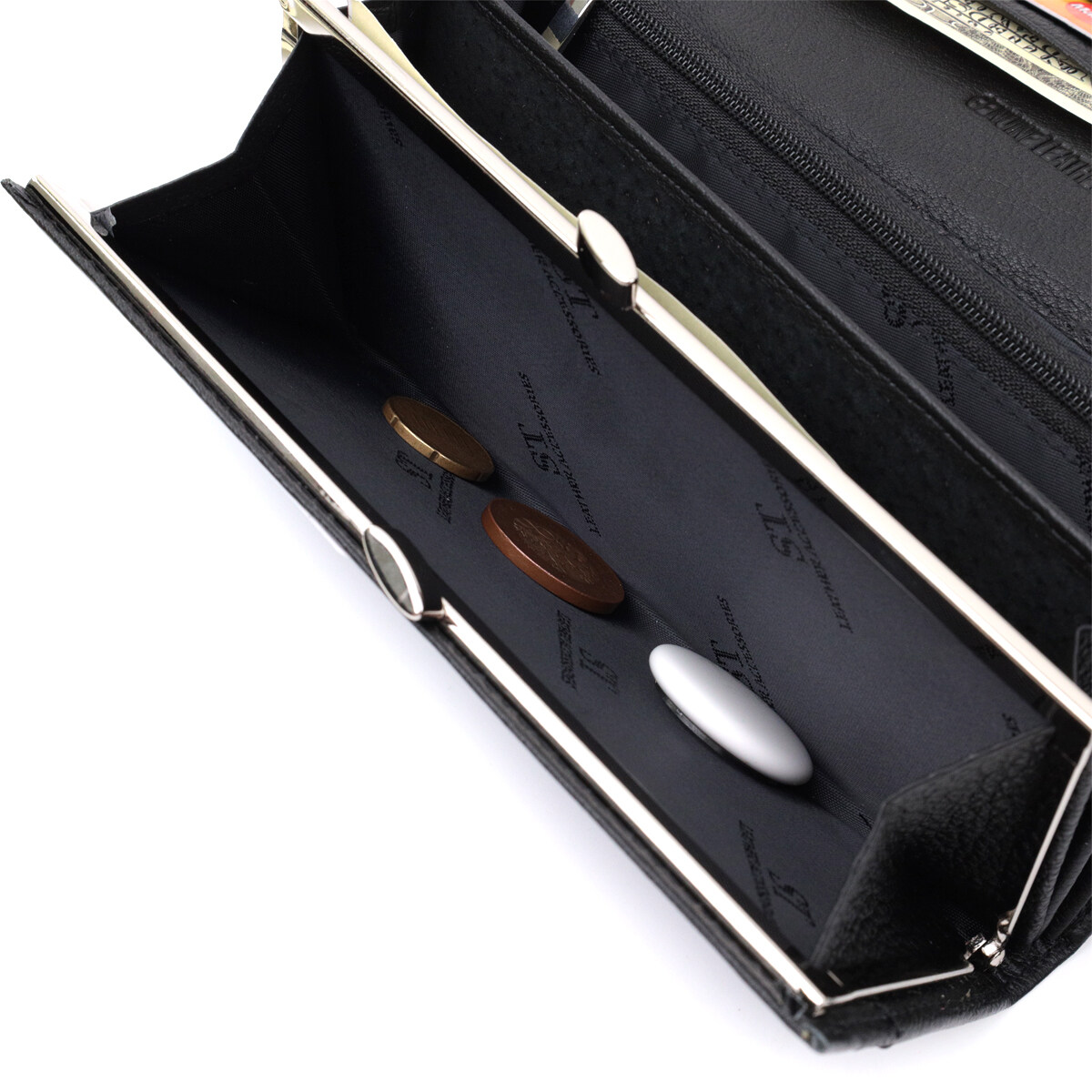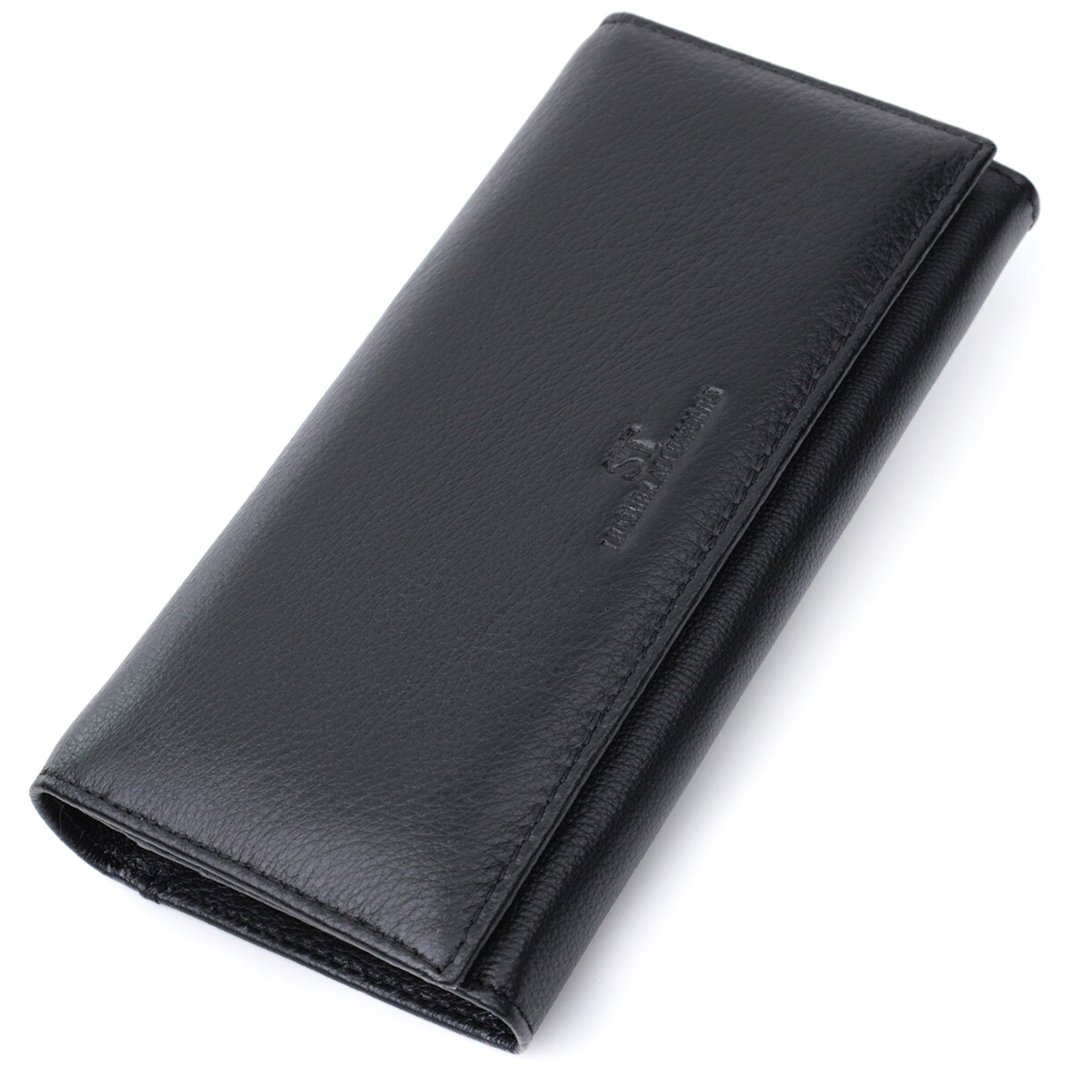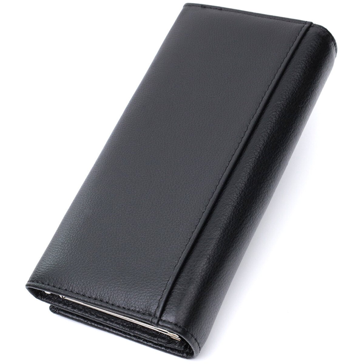 Місткий жіночий гаманець у два складення з натуральної якісної шкіри. Для перегородки між відділеннями використовується натуральна шкіра та міцний текстиль. Виріб складається з трьох великих відділень для купюр, двох прилеглих кишень, кишені на блискавці, восьми осередків для карток та монетниці. Продається гаманець у красивій коробці від виробника. Закривається гаманець клапаном на магніти.