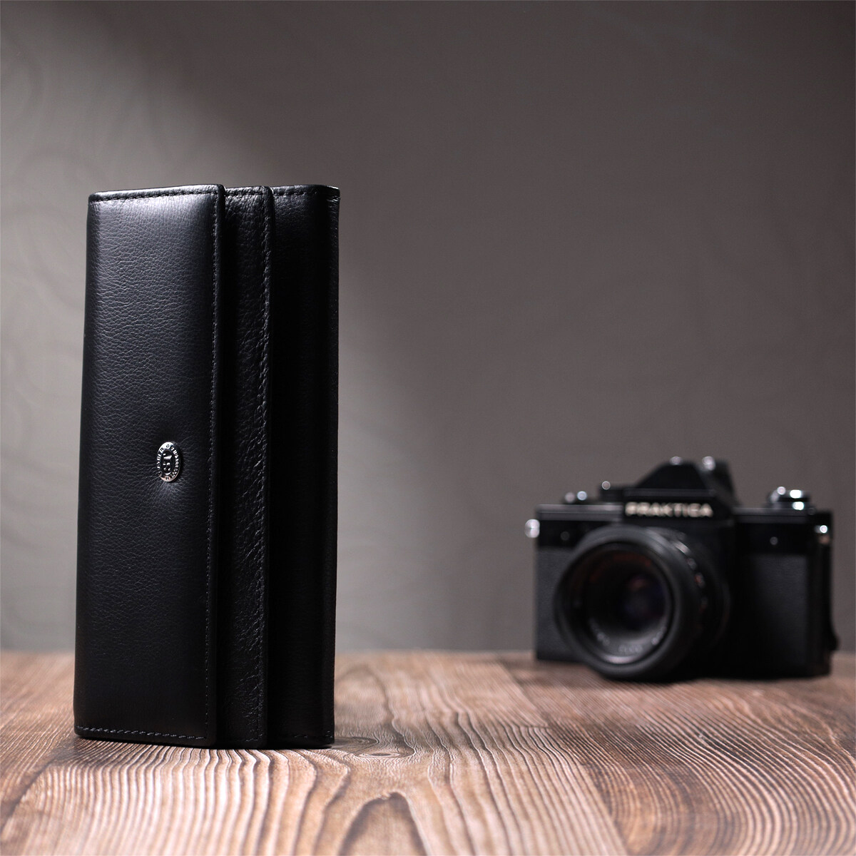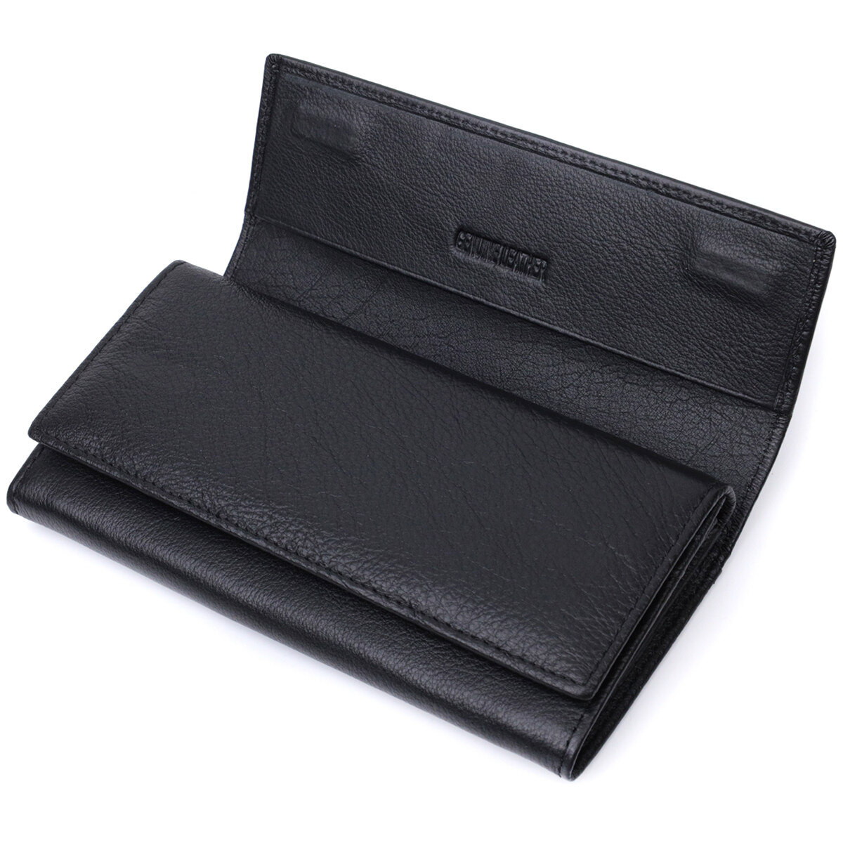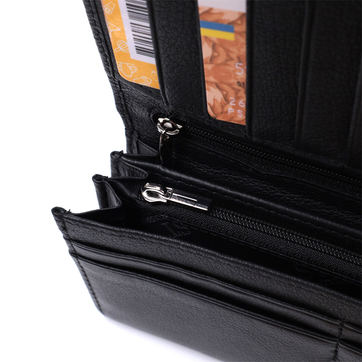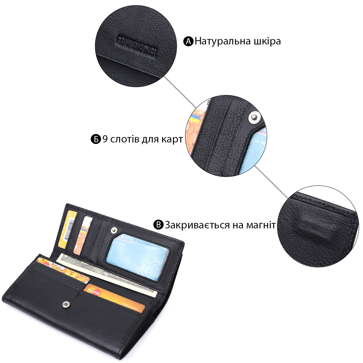 Особливості: великий формат, подвійне складання, два клапани, для карток, купюр і монет.