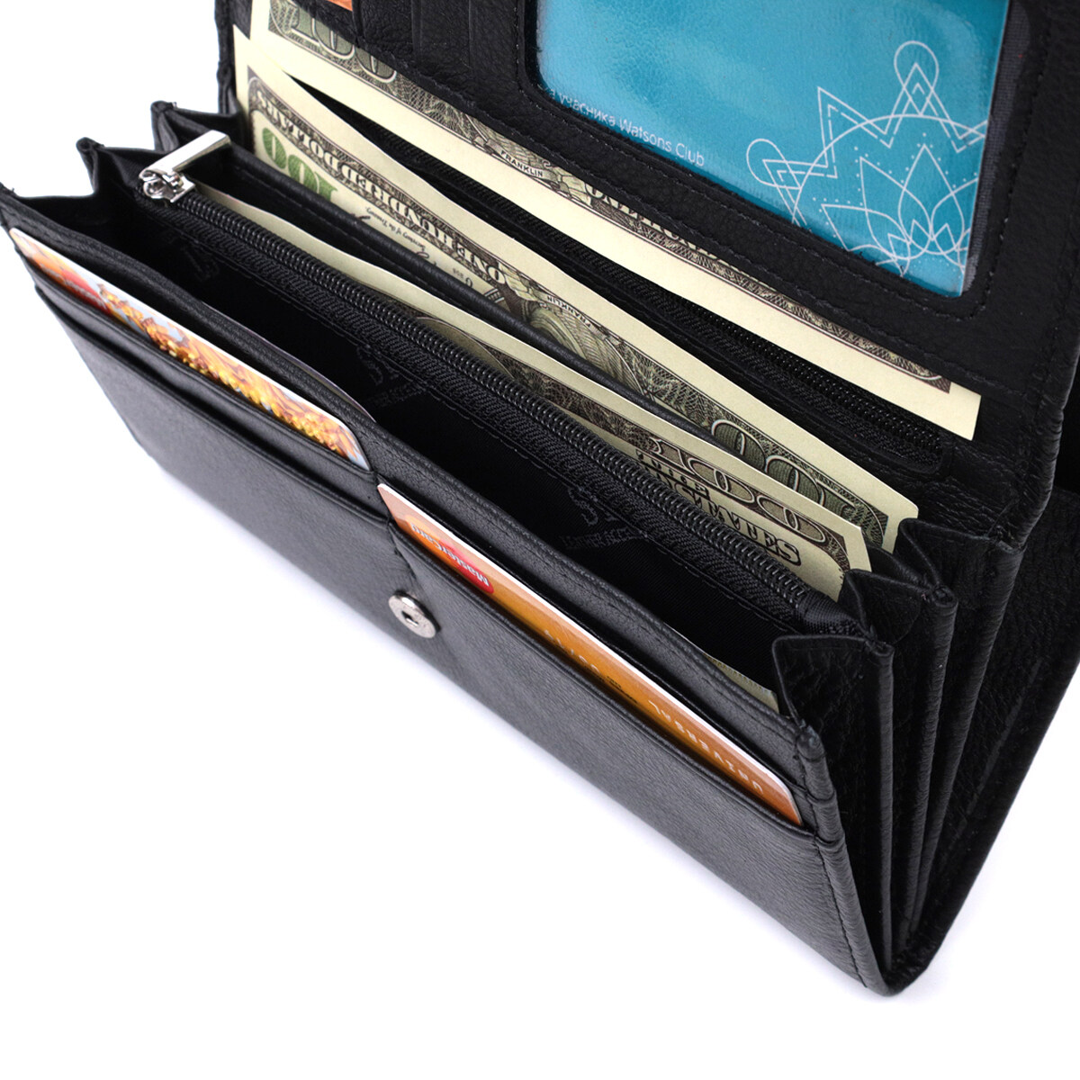 Гаманець закривається у два складання клапаном на кнопку. Усередині передбачені три відділення для купюр, дві кишені на блискавках, чотири прилеглі кишені та дев’ять слотів для пластикових карток. Зовні розташована окрема кишеня для монет, що робить використання аксесуара ще зручнішим у повсякденному житті.