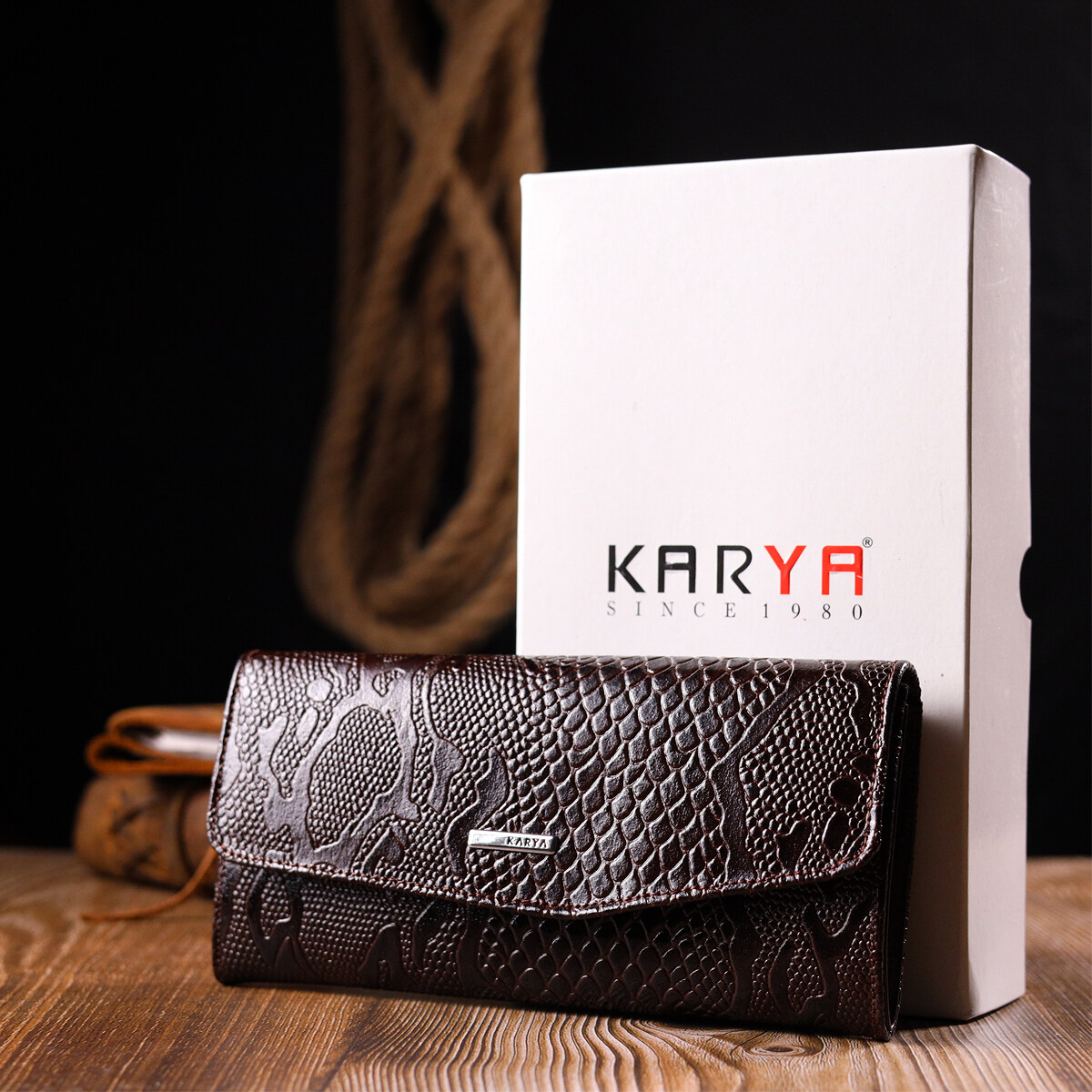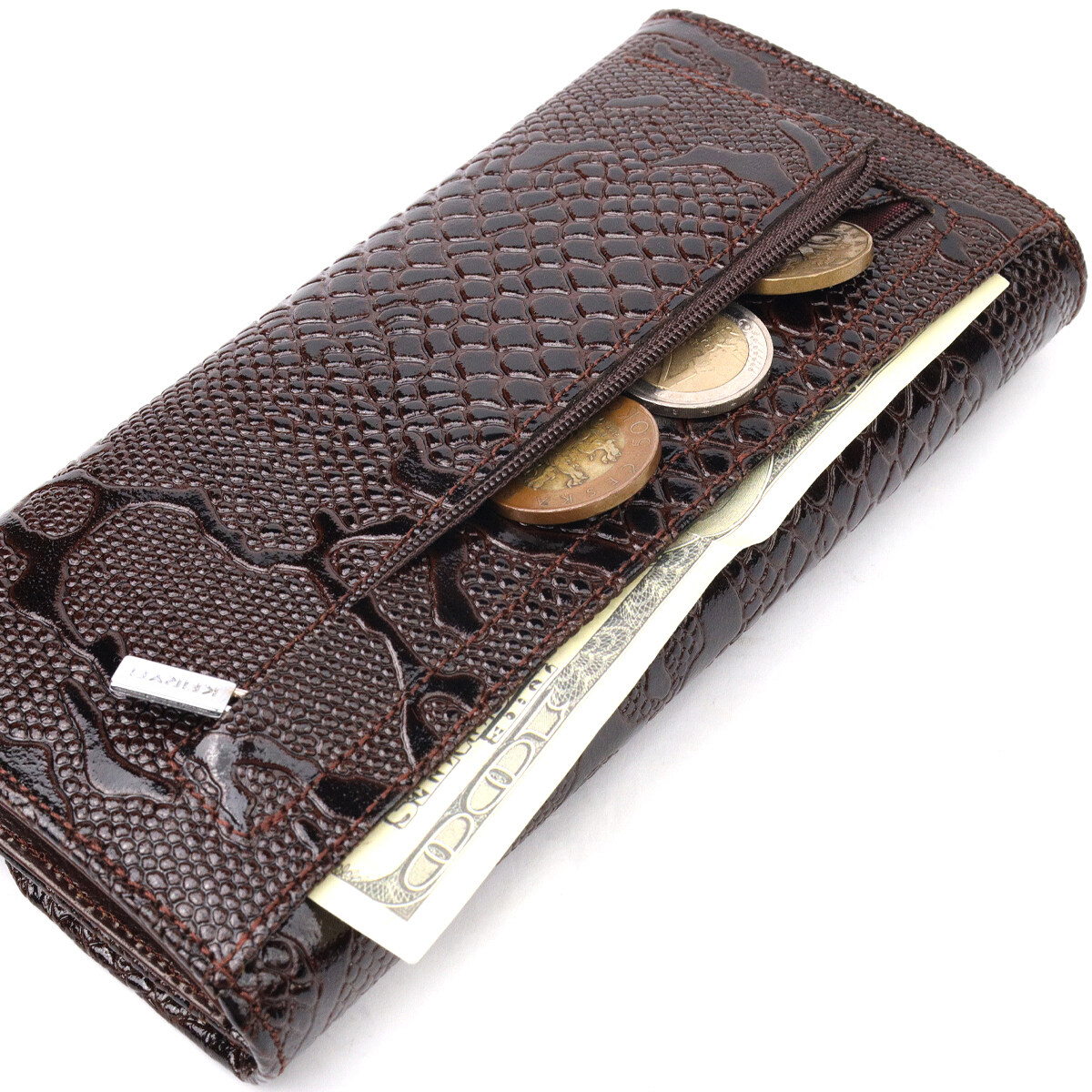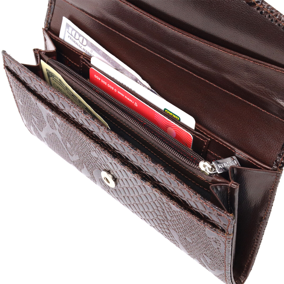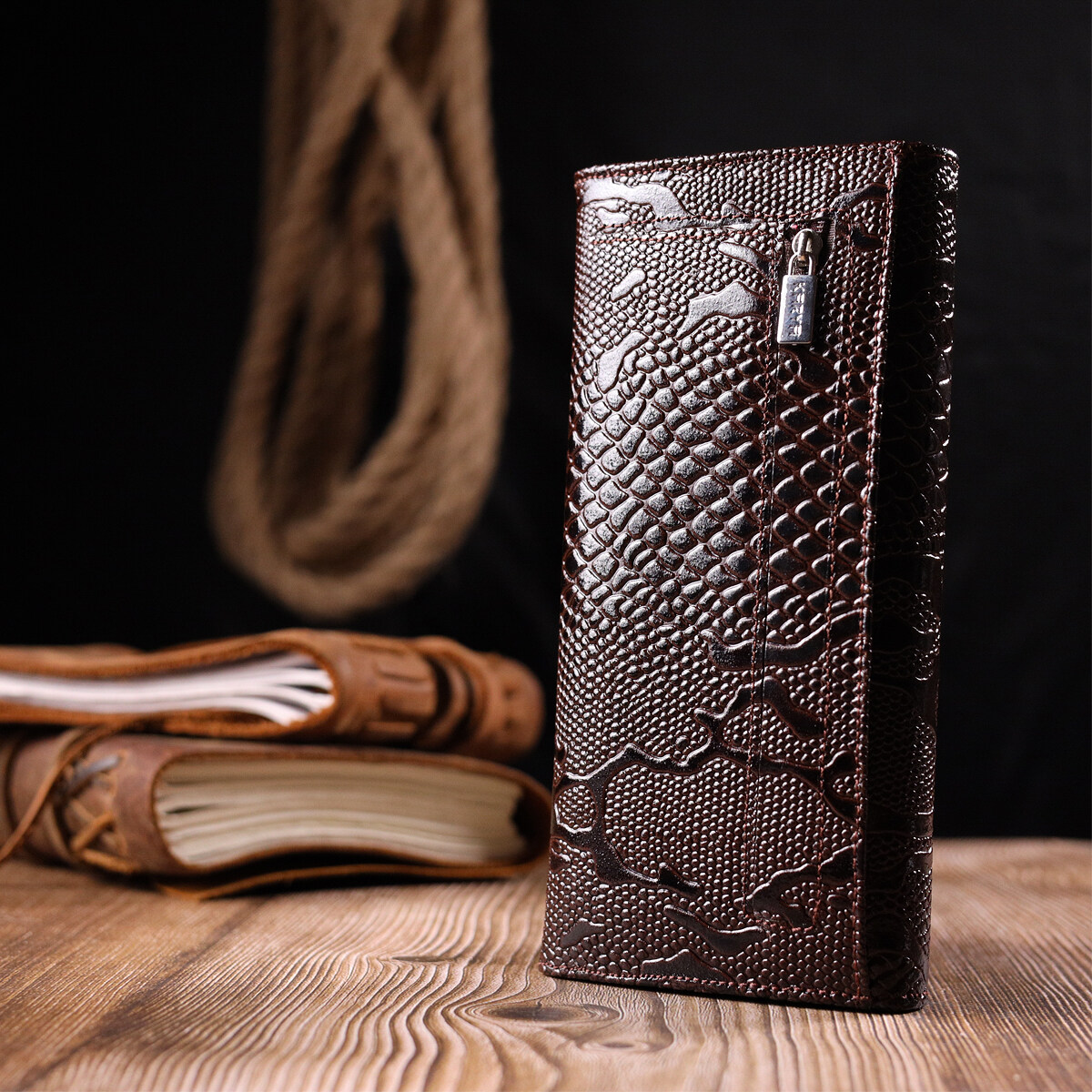 Багатофункціональний жіночий гаманець із натуральної шкіри, з тисненням під рептилію. Складається аксесуар навпіл, закривається клапаном на кнопку. Якісна фурнітура доповнює та прикрашає виріб. Такий гаманець з натуральної шкіри - це ідеальний варіант на кожен день для тих, хто цінує якість, зручність та комфорт, а також чудово доповнюватиме Ваш повсякденний образ. Запакований аксесуар у фірмову коробку та пакет бренду. Вироби з натуральної шкіри завжди будуть чудовим подарунком для близької людини.