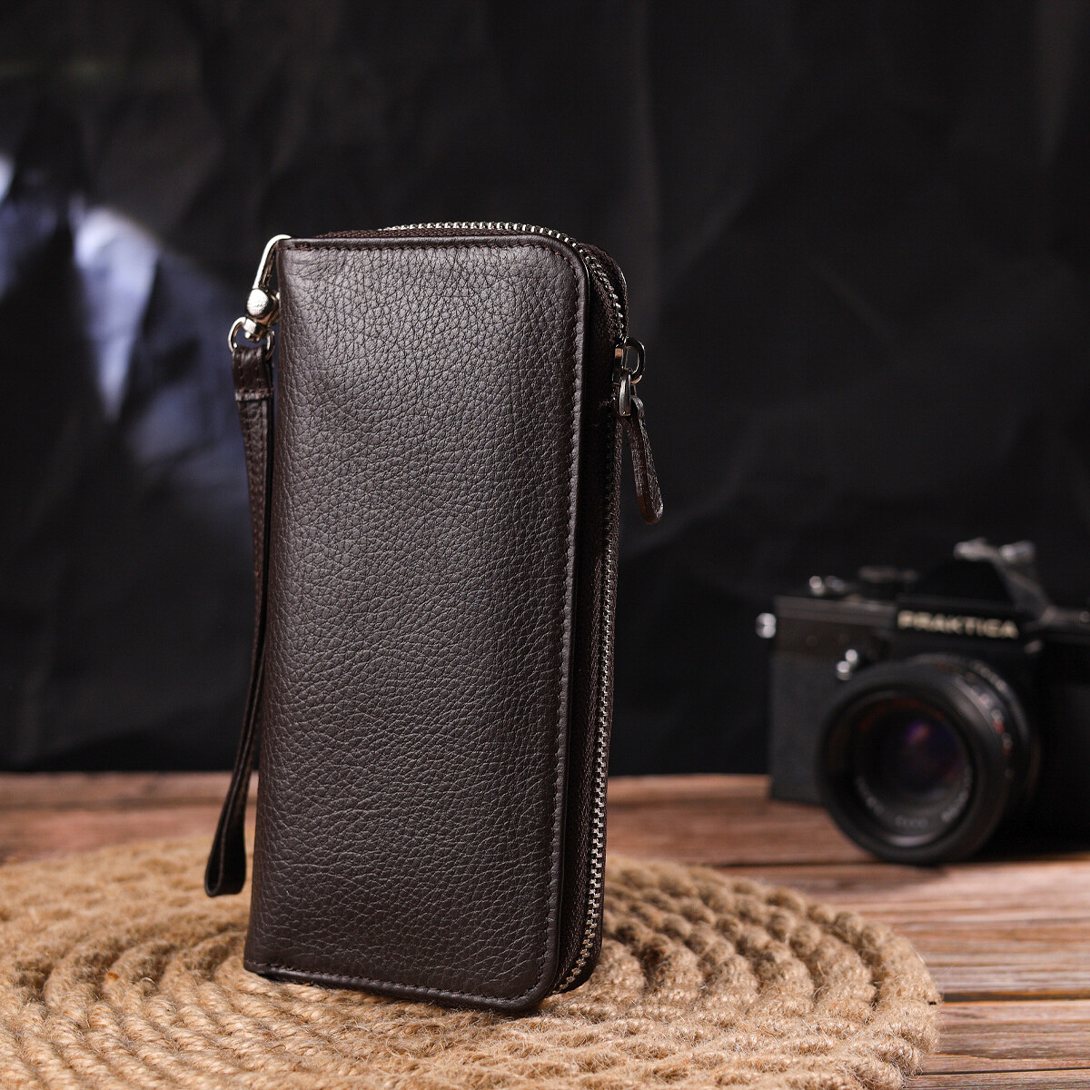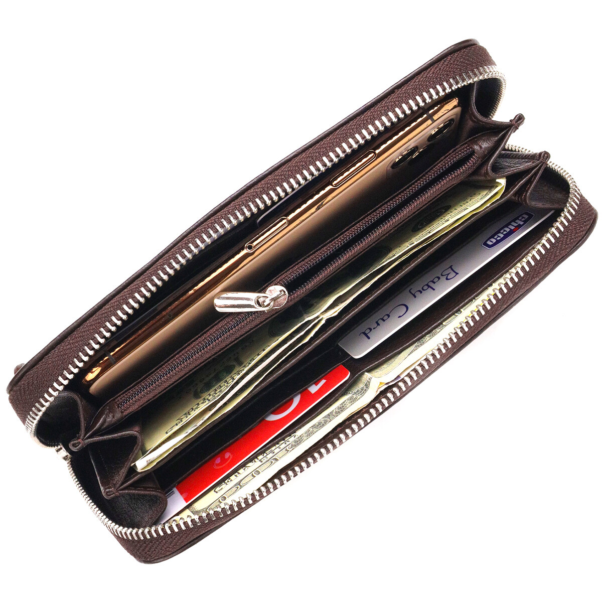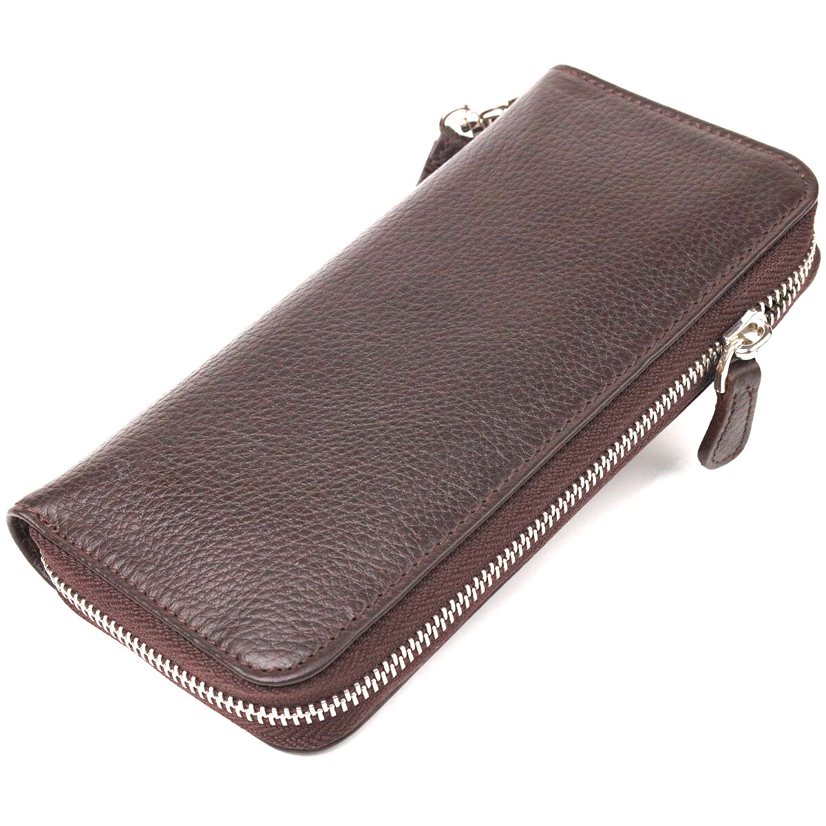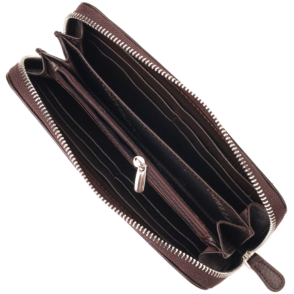 Місткий жіночий гаманець, з натуральної шкіри. Аксесуар має три основні відділення, в які поміщаються купюри всіх номіналів, дві перегородки, одна з них на блискавці, вісім кишень для карток, дві прилеглі кишені та знімний кистьовий ремінь. Закривається аксесуар на блискавку. Відмінний аксесуар, надійний виробник, який прослужить дуже довго.