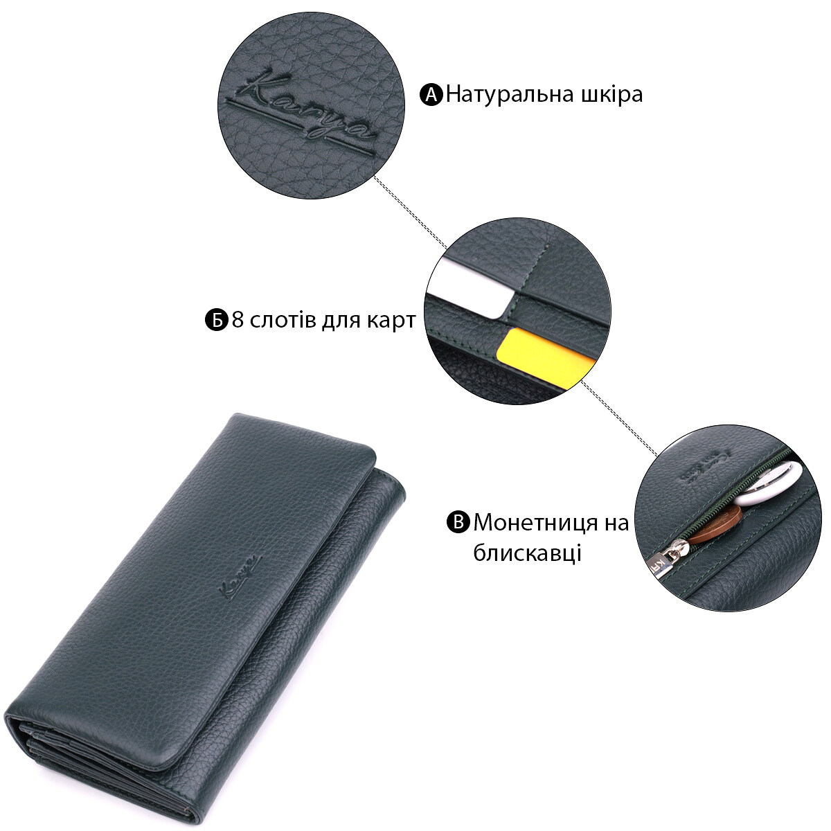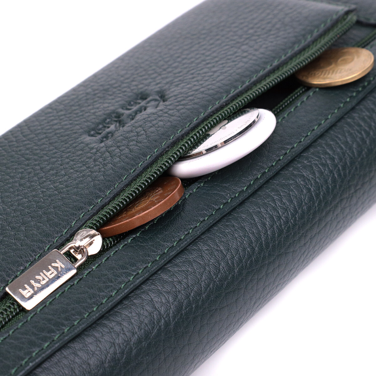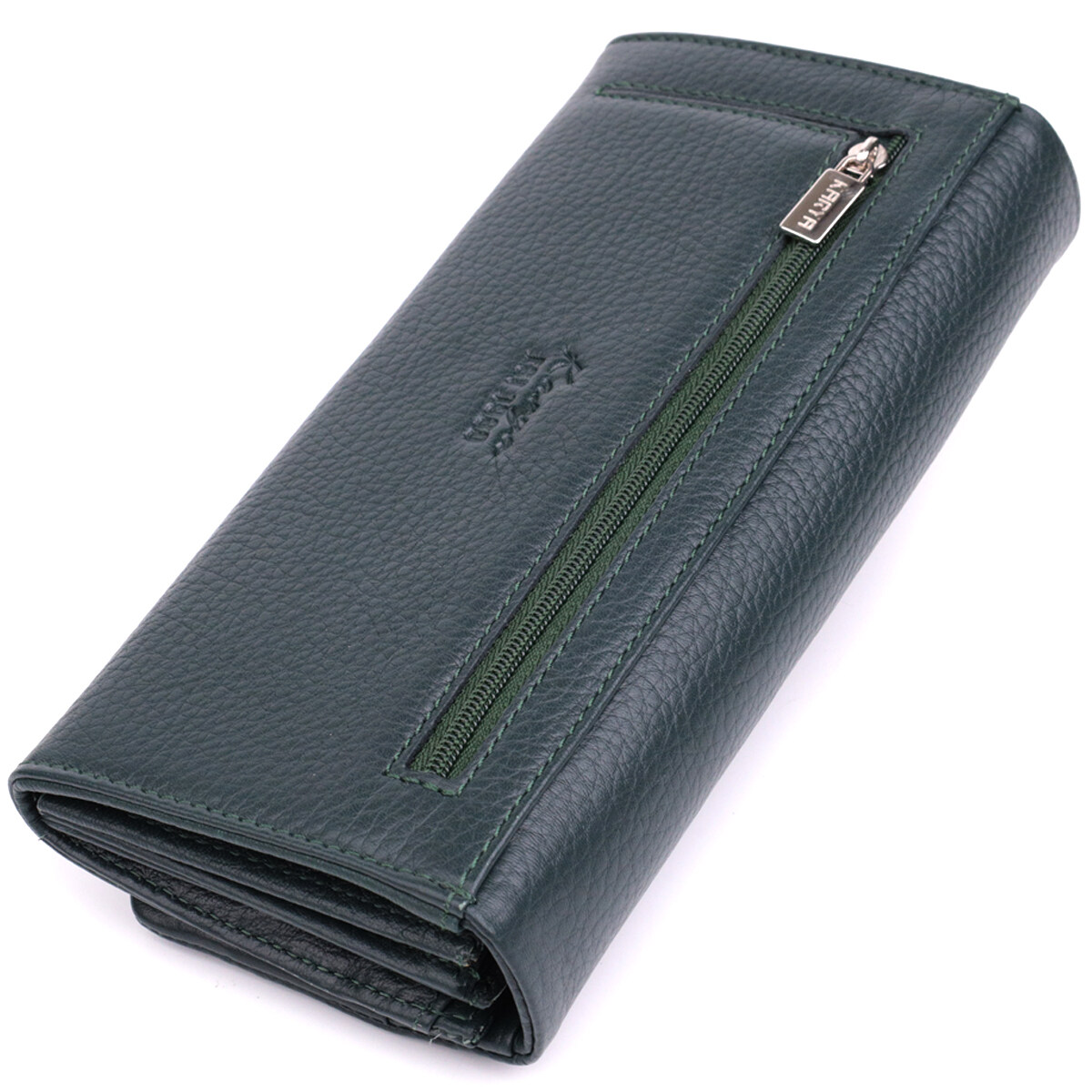 Практичний жіночий гаманець із натуральної шкіри. Модель створена у красивому зеленому кольорі. Гаманець зручно лежить у руці. Дизайн гаманця продуманий для зручності будь-якої дівчини. У гаманець Ви зможете розмістити всі ваші гроші, картки та візитки. На лицьовій стороні аксесуара тиснення логотипу бренду. У комплекті до гаманця йде фірмове картонне пакування. Гаманець від турецького бренду стане чудовим подарунком для будь-якої дівчини.