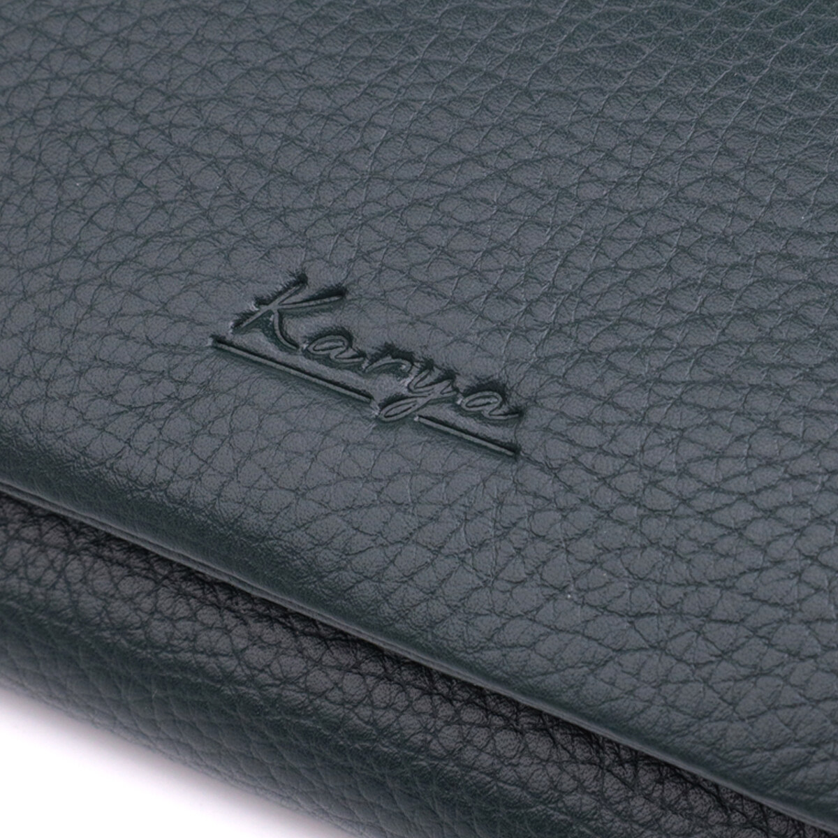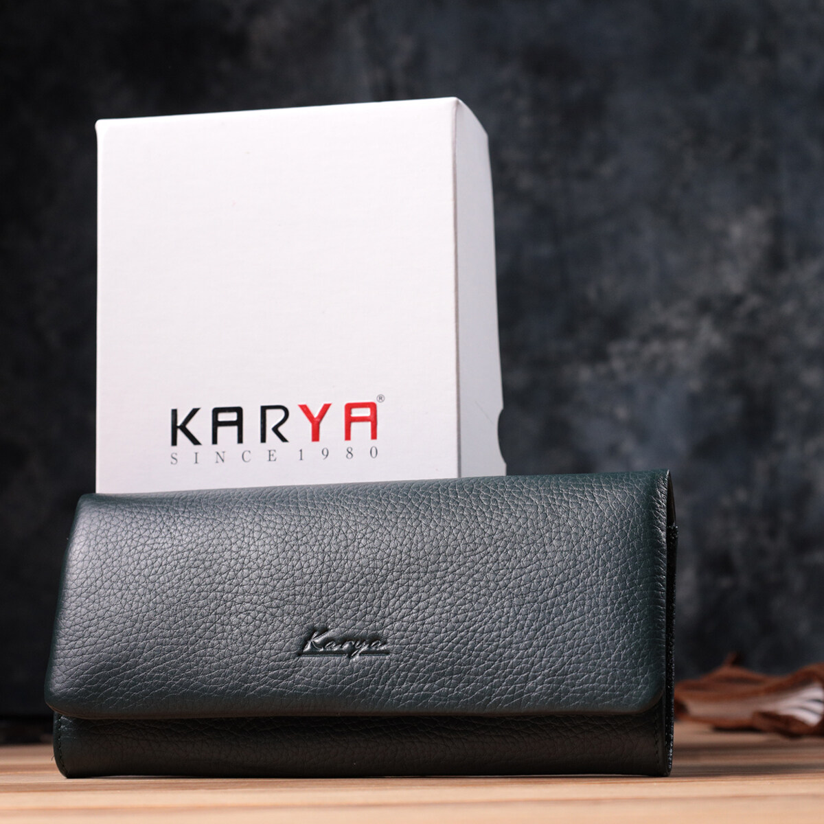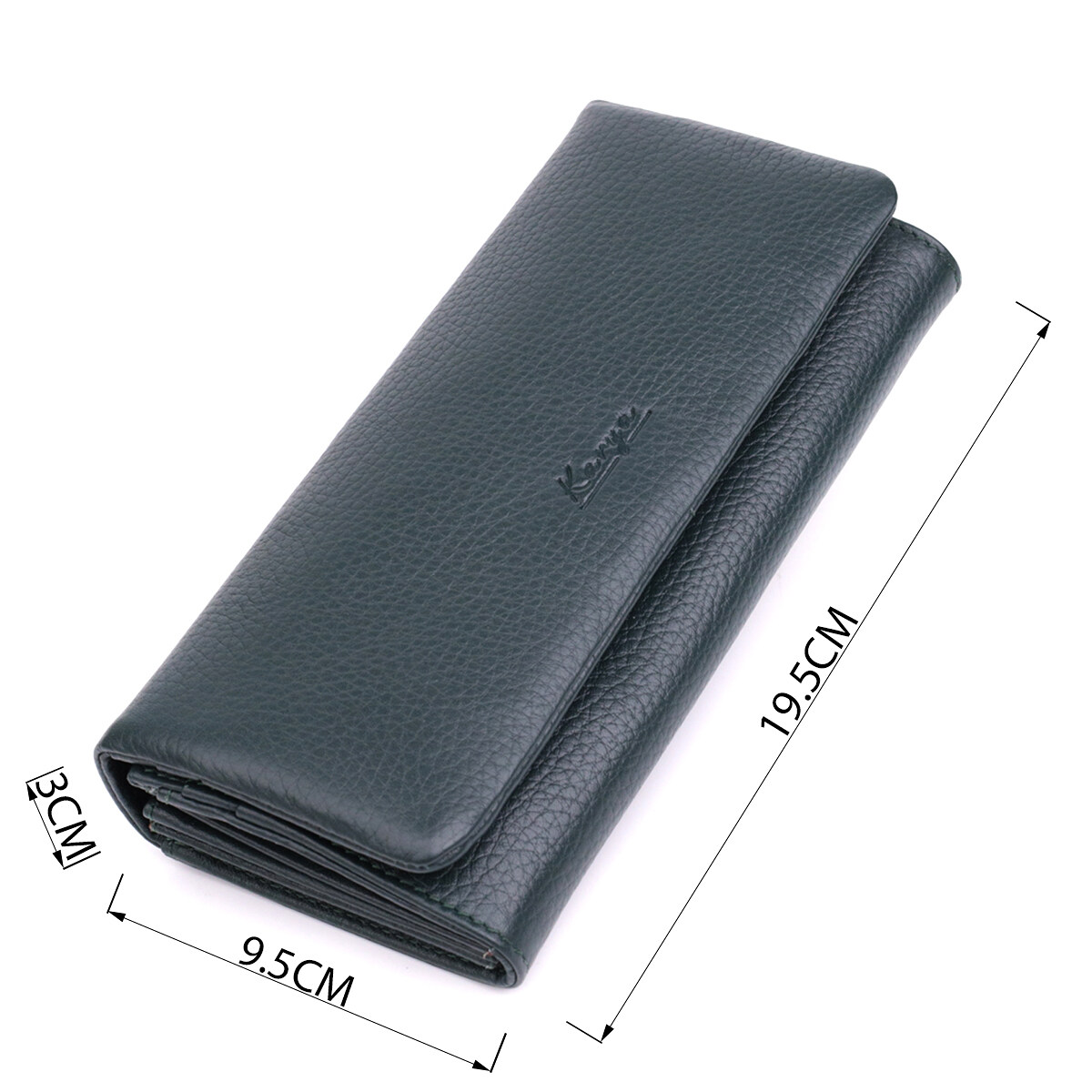 Практичний жіночий гаманець із натуральної шкіри. Модель створена у красивому зеленому кольорі. Гаманець зручно лежить у руці. Дизайн гаманця продуманий для зручності будь-якої дівчини. У гаманець Ви зможете розмістити всі ваші гроші, картки та візитки. На лицьовій стороні аксесуара тиснення логотипу бренду. У комплекті до гаманця йде фірмове картонне пакування. Гаманець від турецького бренду стане чудовим подарунком для будь-якої дівчини.