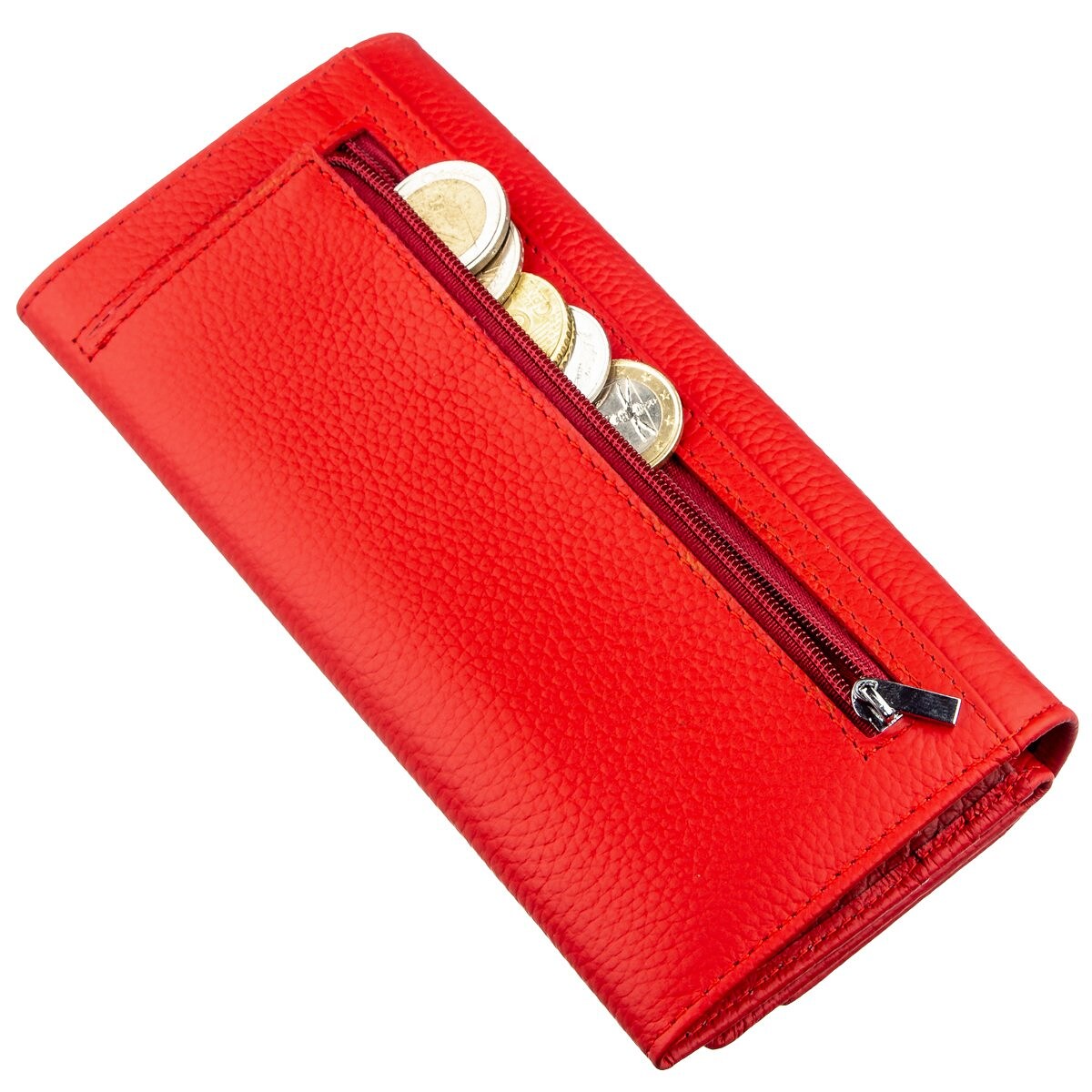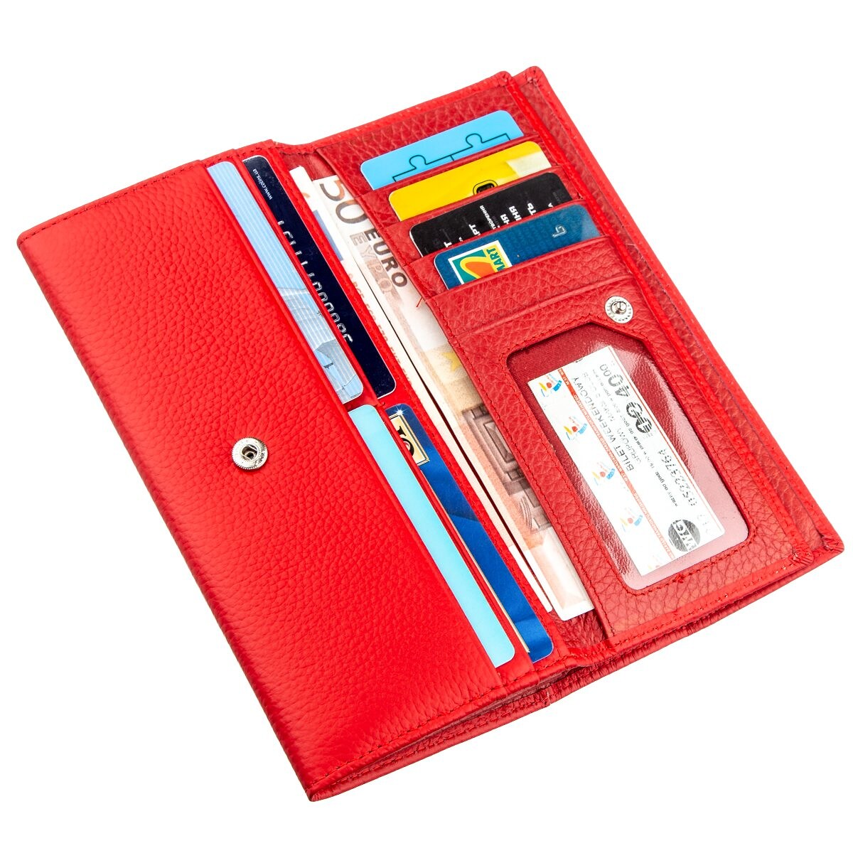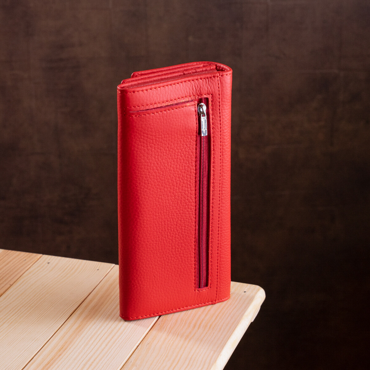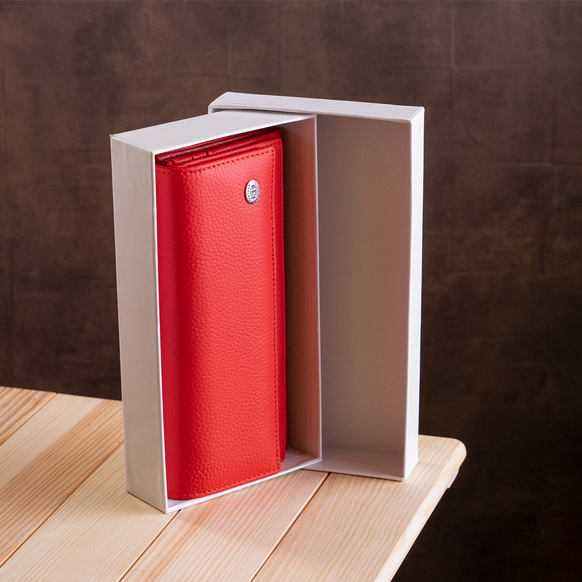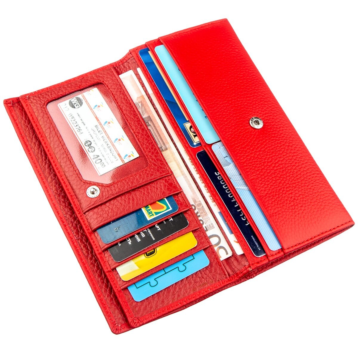 Жіночий гаманець з візитницею для ефектних і впевнених у собі жінок. Відрізняється красивим і сучасним дизайном, який чудово поєднується з особливою практичністю вироби. Гаманець виконаний з натуральної шкіри з відмінною зносостійкістю і високими показниками якості. Колір гаманця червоний з матовим відтінком, на вигляд дуже соковитий і яскравий. Основна частина гаманця представлена місткими відділеннями для купюр і інших цінностей. Монетниця знаходиться на зовнішній стороні і закривається на блискавку. Візитниця, як і сам гаманець закривається на кнопку. Упаковано виріб в щільну фірмову картонну коробку білого кольору.