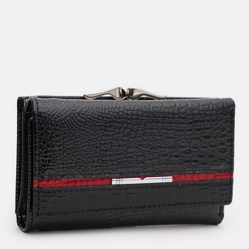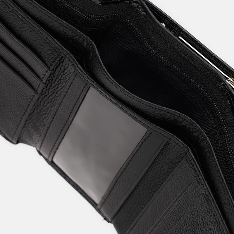 Ця модель жіночого гаманця – втілення елегантності та зручності. Закривається кнопку. Усередині знаходяться два відділення для купюр та додаткове на блискавці, 7 відділів під карти, 1-монетниця з тильного боку гаманця. Підкладка: Текстиль.