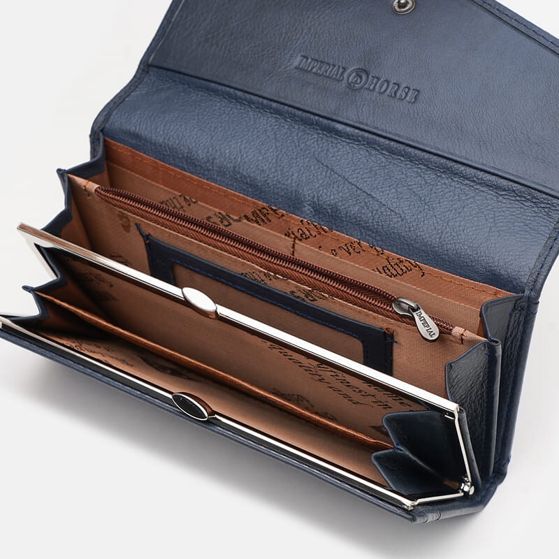Стильний гаманець середнього розміру - гідний аксесуар для сучасної леді. Закривається на кнопку, всередині гаманця 3 кишені під купюри, 1 прихована кишеня, 1 кишеня на блискавці, 1 монетниця на замку, 10 кишеньок для карток. Зовні 1 кишеня. Підкладка- текстиль. Колір фурнітури-срібло.