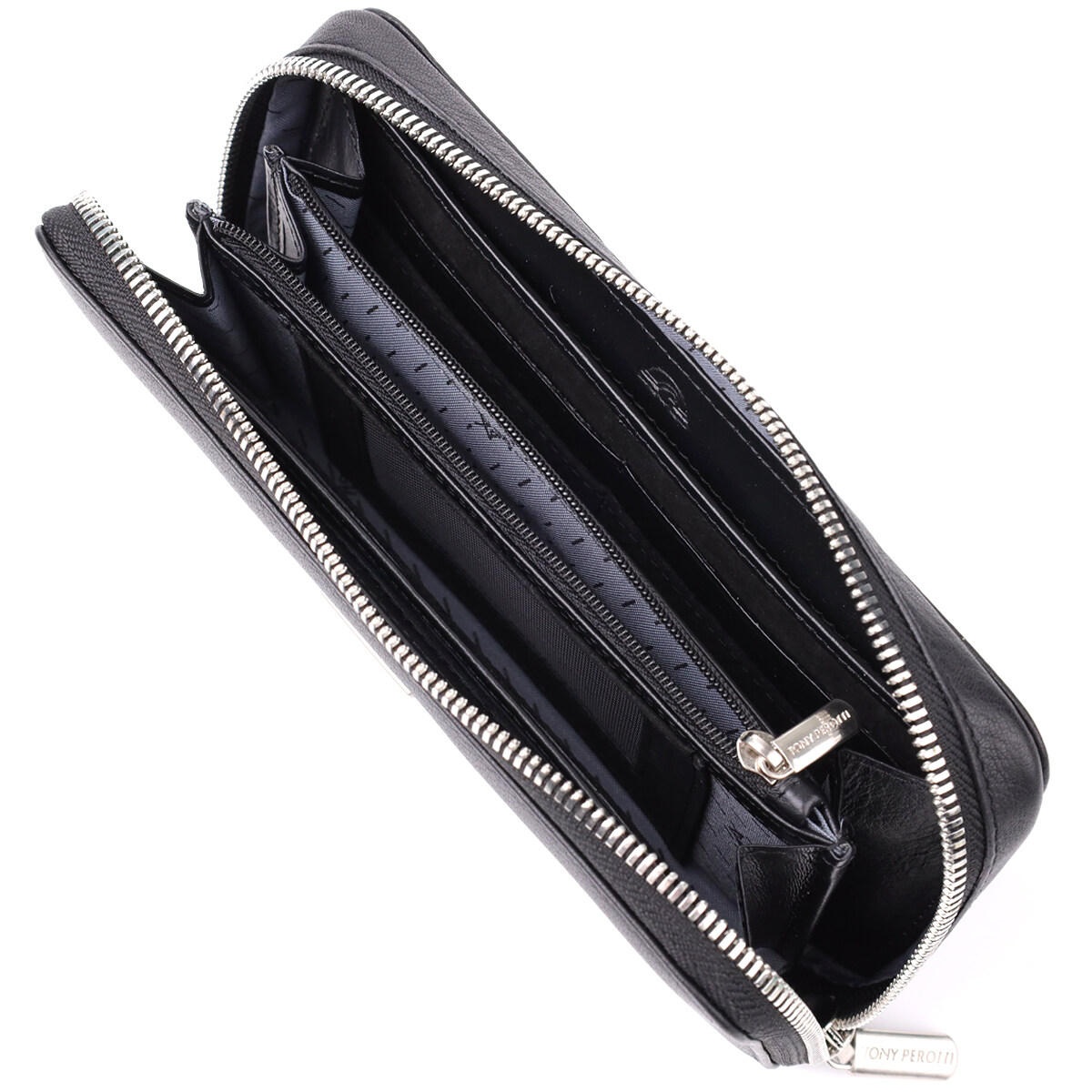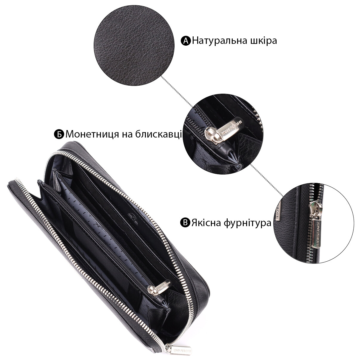 Жіночий шкіряний гаманець із натуральної зернистої шкіри чорного кольору – стильний та практичний аксесуар на кожен день. Місткі відділення для купюр, монетниця, кишені та слоти для карток забезпечують зручну організацію. Лаконічний дизайн робить модель універсальною, а якісні матеріали гарантують довговічність та елегантний зовнішній вигляд.
