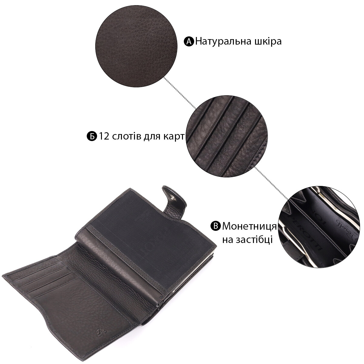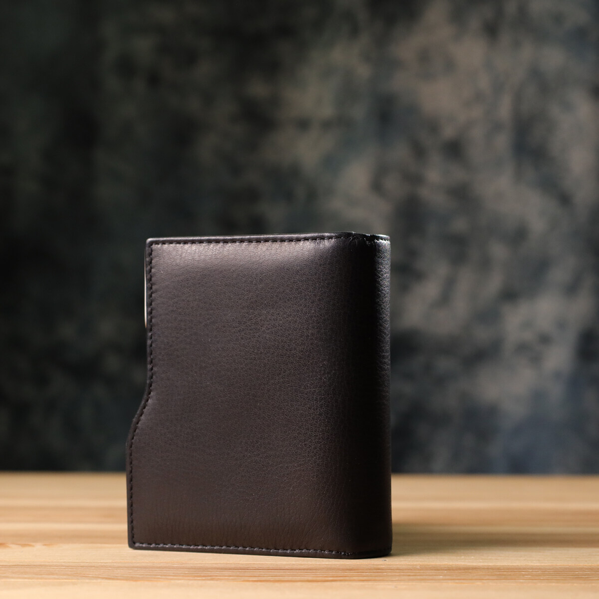 Гаманець виконаний з м'якої натуральної шкіри чорного кольору, яка приємно лежить у руці та відрізняється довговічністю. Усередині передбачені два основні відділення для купюр, дві прилеглі кишені, монетниця на механічній клямці, кишеня під сіточкою та дванадцять слотів для кредитних карток. На лицьовій стороні в нижньому правому кутку розташований металевий логотип бренду, що підкреслює автентичність та елегантність виробу. Закривається хлястиком на кнопку, що забезпечує зручність та надійність у використанні.