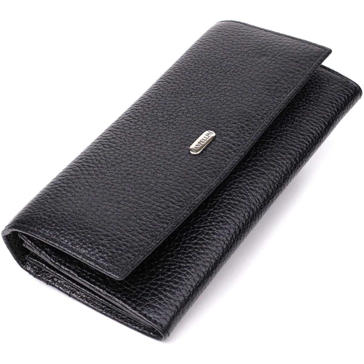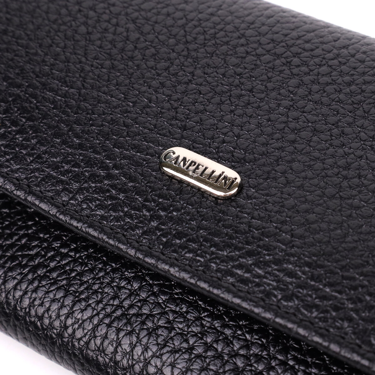 Елегантний гаманець CANPELLINI з натуральної чорної шкіри з виразною великозернистою фактурою стане надійним та практичним аксесуаром для сучасного чоловіка. Місткий, він має кілька відділень для купюр та карт, зручні кишені для дрібниць та монетницю на блискавці. Металевий фірмовий логотип підкреслює статус та оригінальність виробу.