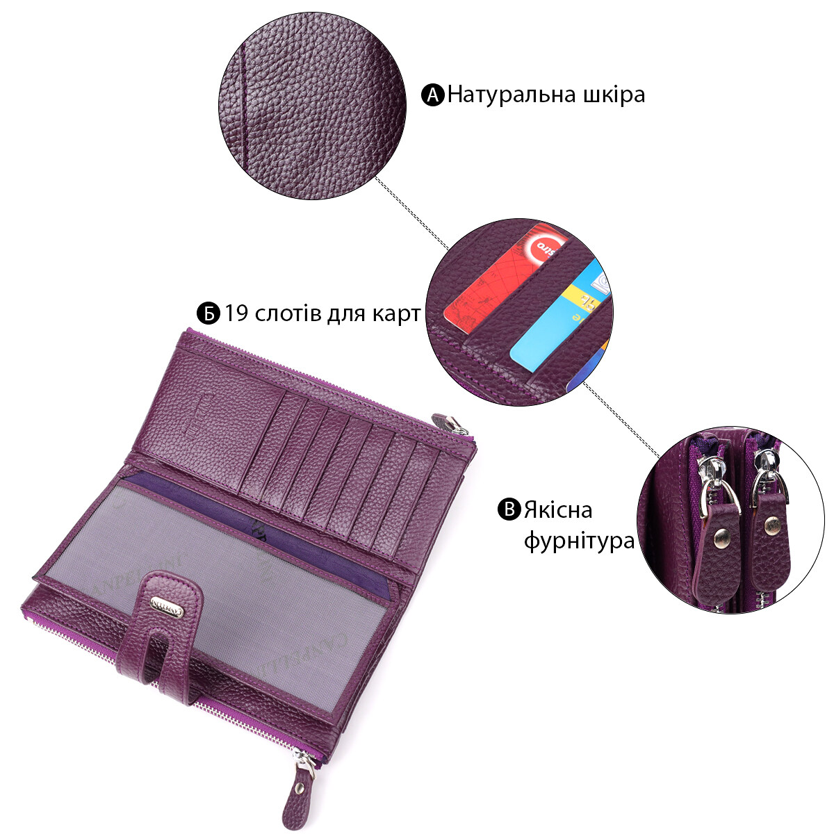 Елегантний шкіряний гаманець із натуральної шкіри турецького виробництва поєднує місткість та зручність. Безліч осередків для карт та документів, відділення на блискавці та кишені дозволяють органічно розмістити все необхідне. Стильний дизайн із металевим логотипом та фурнітурою під срібло підкреслює сучасний та витончений характер аксесуара.