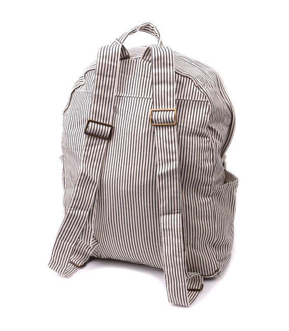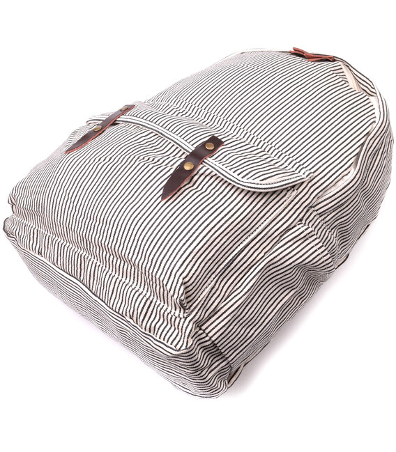 Універсальний рюкзак молочного кольору у чорну вертикальну смужку із якісного текстилю. Рюкзак дуже місткий та має дуже практичний функціонал. Носити виріб можна в руках, для цього передбачена текстильна ручка, а також на спині завдяки текстильним лямкам, що регулюються. Фурнітура яка використана у рюкзаку якісна, прослужить не один рік.