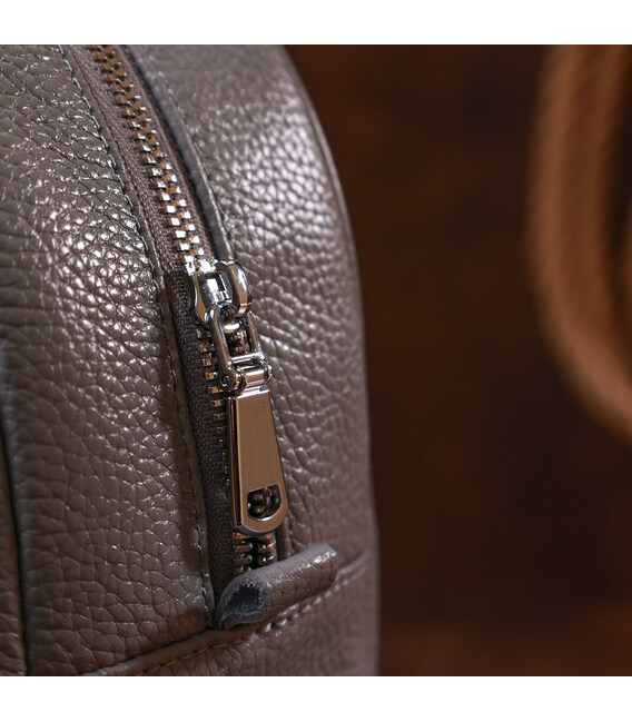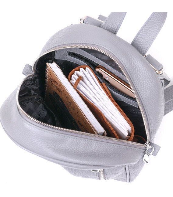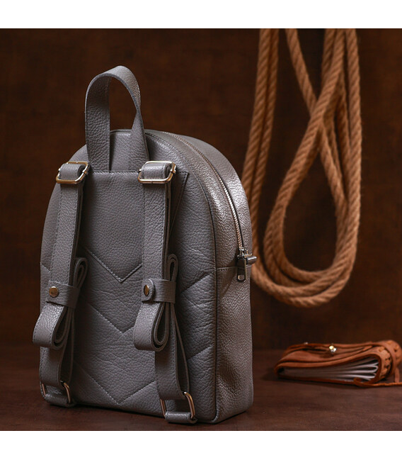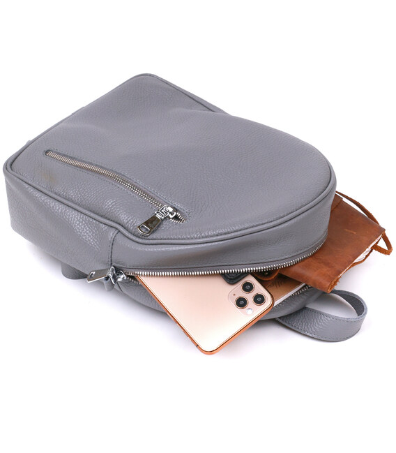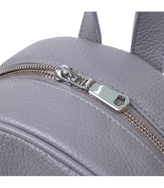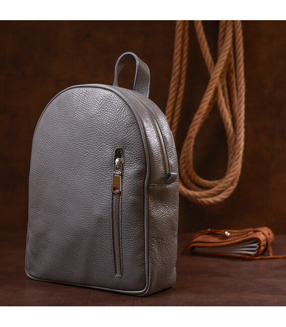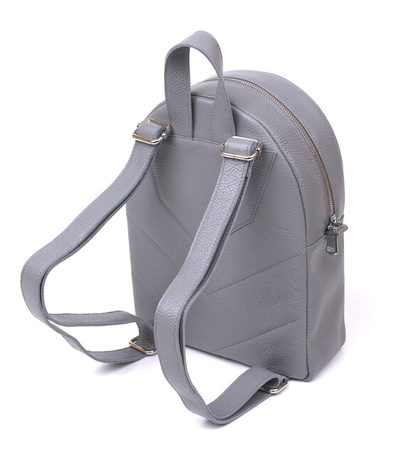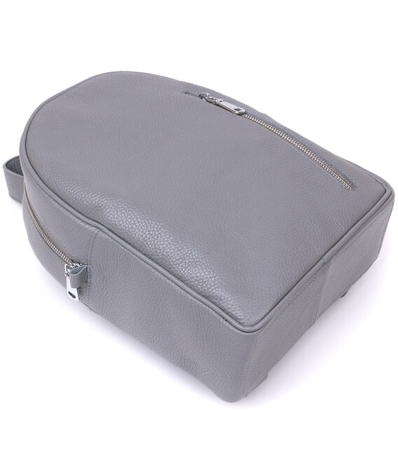 Стильний рюкзак невеликого розміру в міському стилі для цінителів аксесуарів без особливих надмірностей. Матеріал виготовлення – натуральна шкіра високого класу з відмінними характеристиками. Внутрішнє наповнення представлене у вигляді основного відділення та кількох містких кишень. Колір цієї моделі – сірий, фактура – зерниста.