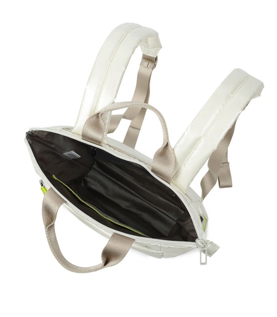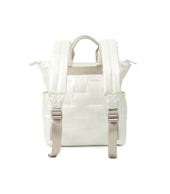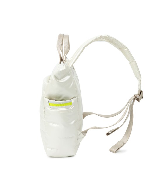 Місткий, дутий рюкзак-ідеальний супутник на кожен день. Оснащений великим основним відділенням з внутрішніми кишенями і знімною косметичкою. Із зовнішнього боку розташована кишеня на блискавці, також є бічні кишені для парасольки або пляшки з карабіном для ключів. Виконаний з щільного 100% polyester.