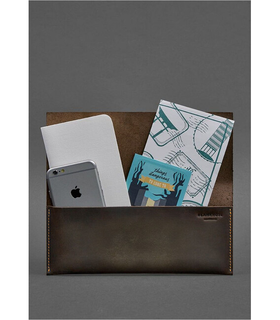 Це холдер для документів зручного розміру, в якому помістяться посадочні талони (або залізничні квитки), паспорта, гроші і маса інших корисних речей, які повинні бути завжди під рукою в подорож. Холдер зроблений повністю вручну з цільного шматка дуже щільною (2 мм) натуральної шкіри. Закривається він на шкіряний хлястик, який кріпиться двома люверсами, за сумісництвом формують держатель для канцелярського приладдя.