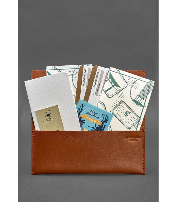 Це холдер для документів зручного розміру, в якому помістяться посадочні талони (або залізничні квитки), паспорта, гроші і маса інших корисних речей, які повинні бути завжди під рукою в подорож. Холдер зроблений повністю вручну з цільного шматка дуже щільною (2 мм) натуральною шкірою. Закривається він на шкіряний хлястик, який кріпиться двома люверсами, за сумісництвом формують держатель для канцелярського приладдя.
