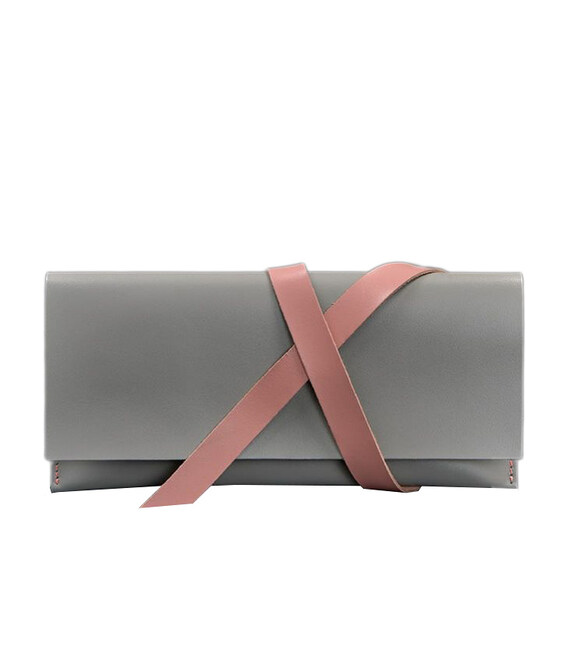 Тревел-кейс Voyager 1.0 зроблений вручну з дуже якісної і щільною натуральної шкіри, сірого кольору. Закривається він на хлястик, який також виготовлений з натуральної шкіри, неймовірно ніжного рожевого кольору. Хлястик кріпиться двома люверсами, за сумісництвом формують держатель для ручки або маркера.